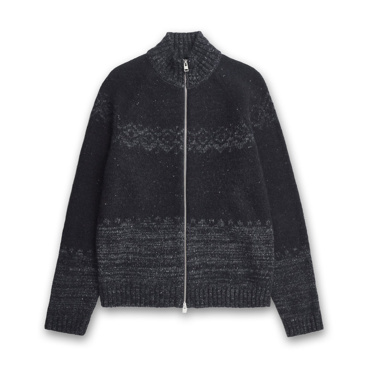 A regular fitted Fair Isle full zip cardigan, made in a wool alpaca blend. The style is constructed with fully fashioned raglan sleeves, tonal Fair Isle pattern, 2-way metal zip and finished with a 2x2 ribbed neck trim, cuffs and hem.