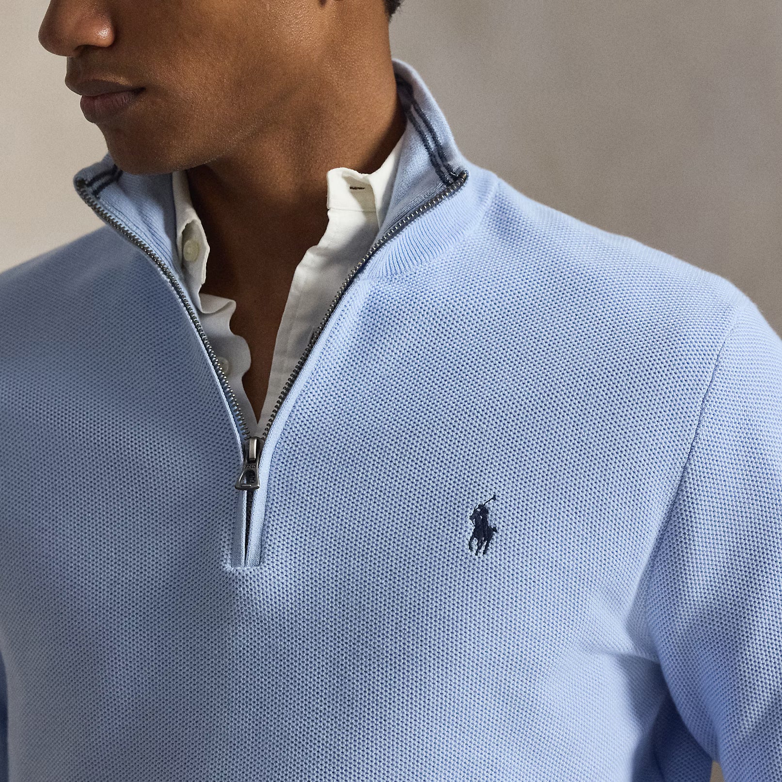 • Rib-knit mockneck. Quarter-zip placket. Custom-developed zip pull with a "Polo" logo.