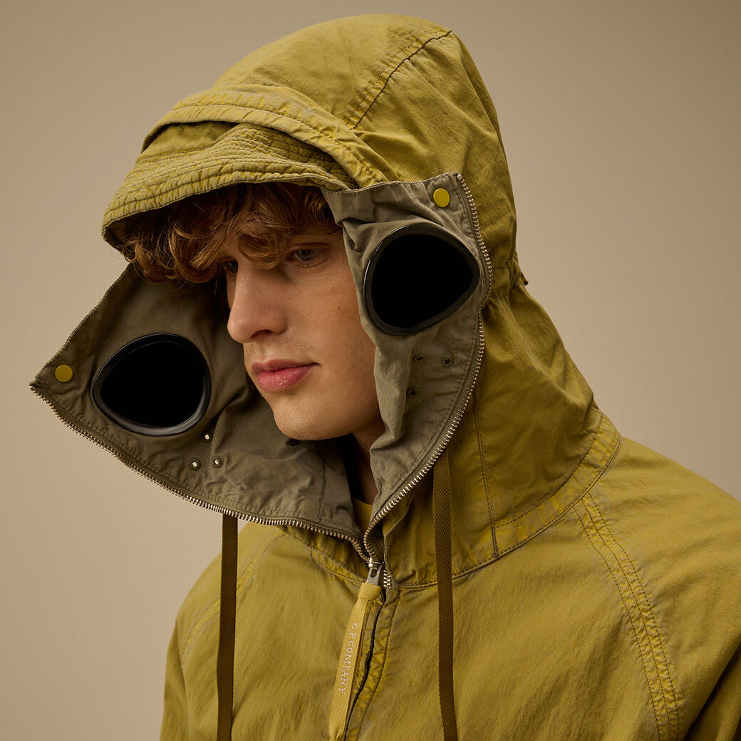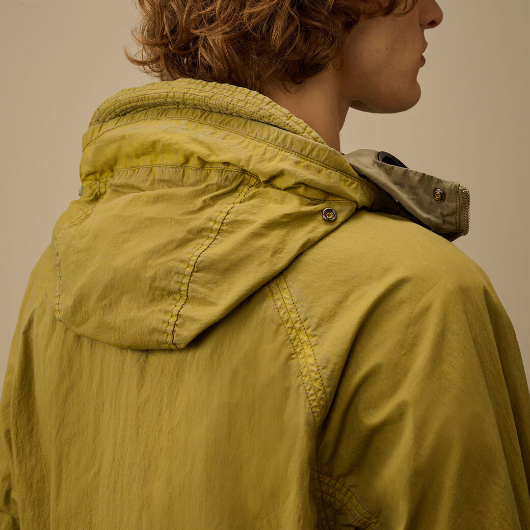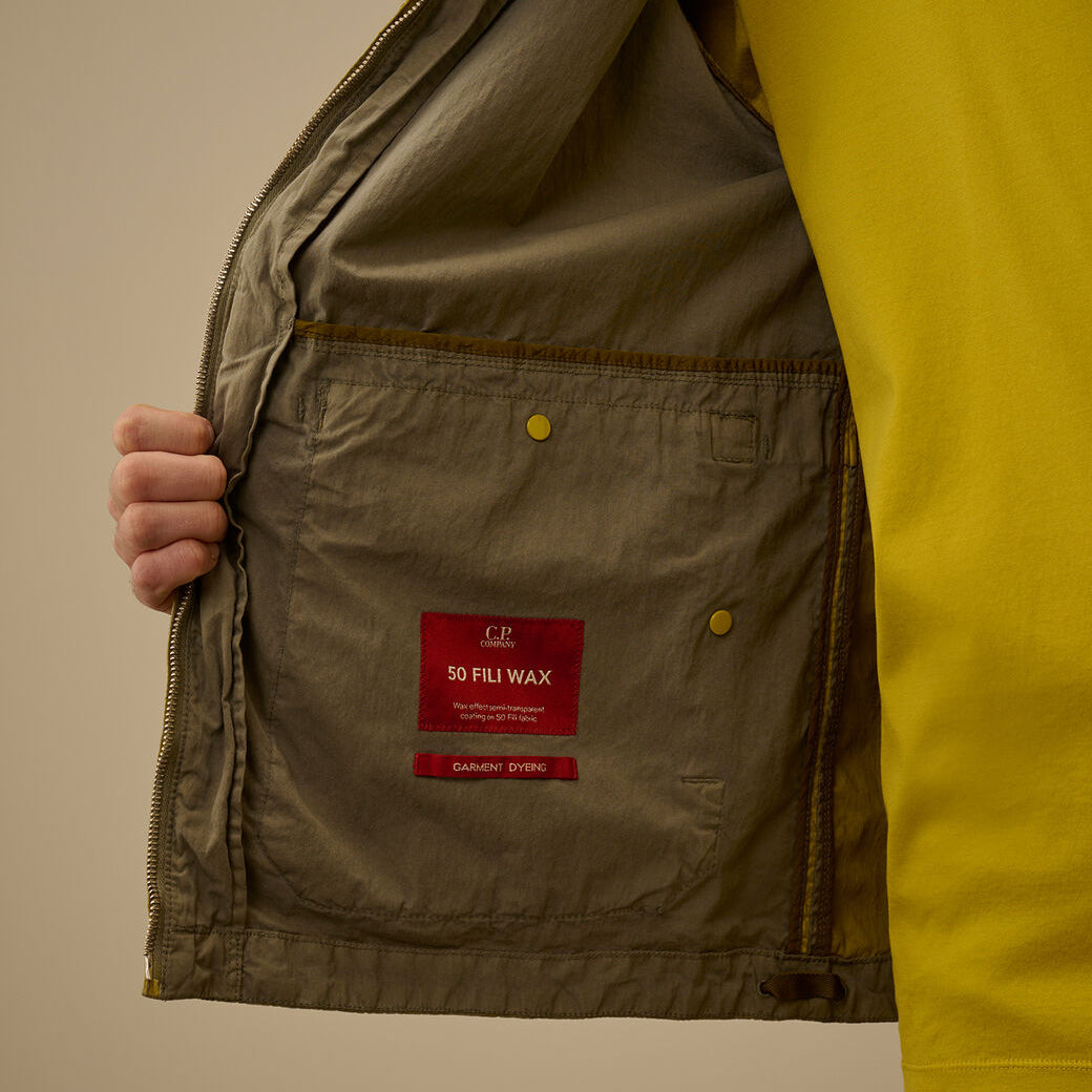 Explorer jacket crafted from 50 Fili Wax, the iconic nylon and cotton fabric by C.P. Company, presented here in a version featuring a semi-transparent, water-resistant synthetic wax-effect coating. The polyurethane outer layer enhances the fabric’s protection against the elements.The model features an adjustable Explorer hood, full zip fastening, and an embroidered logo on the chest. Equipped with hidden front flap pockets with snap-button closure, a drawstring-adjustable hem, and mesh lining for improved breathability. A rear ventilation panel and contrasting details on the back complete the functional and technical design. Garment dyed with a double dyeing process, in which the nylon and cotton fibres are dyed in different colours to create unique tonal contrasts and depth. Finished with an anti-drop treatment. Regular fit.
