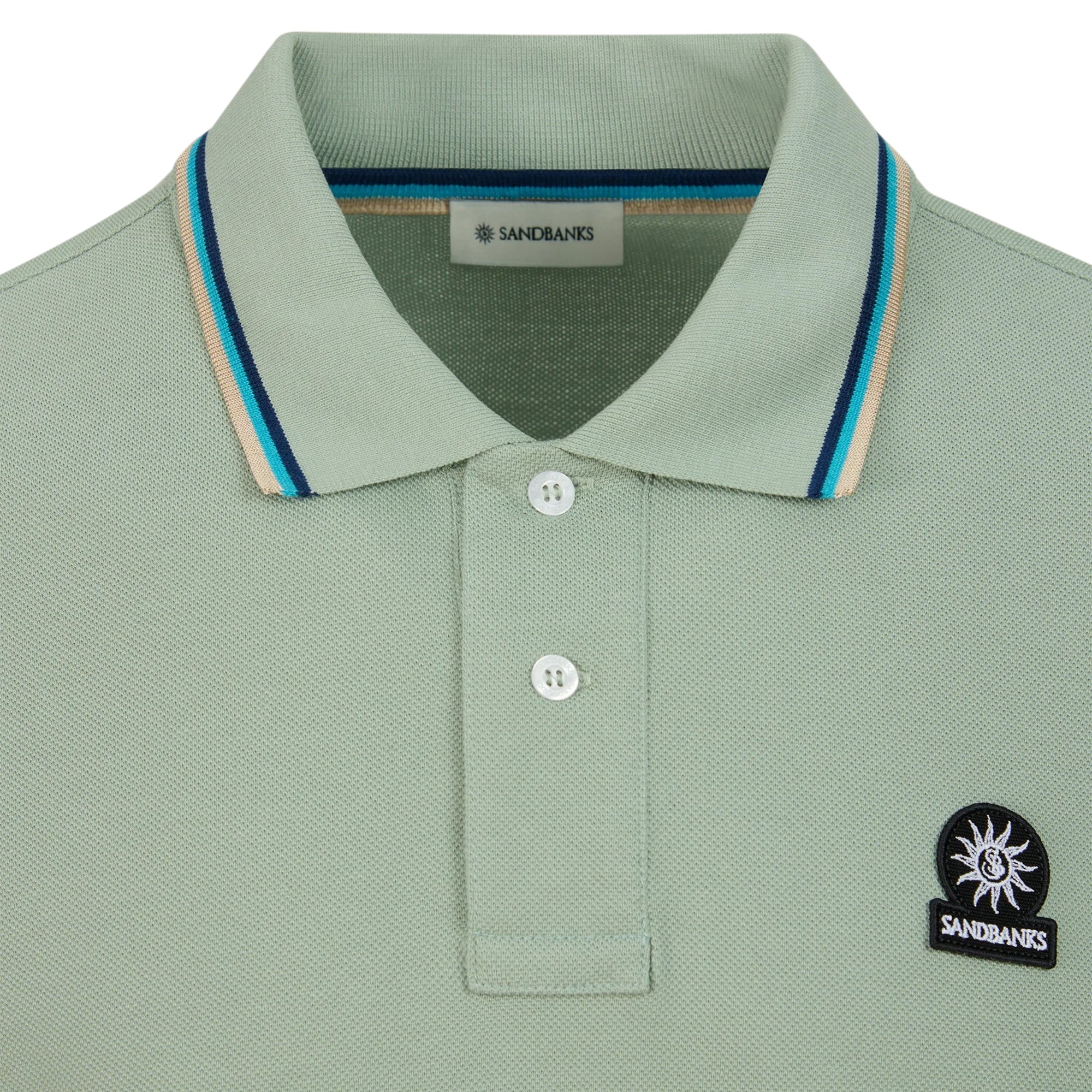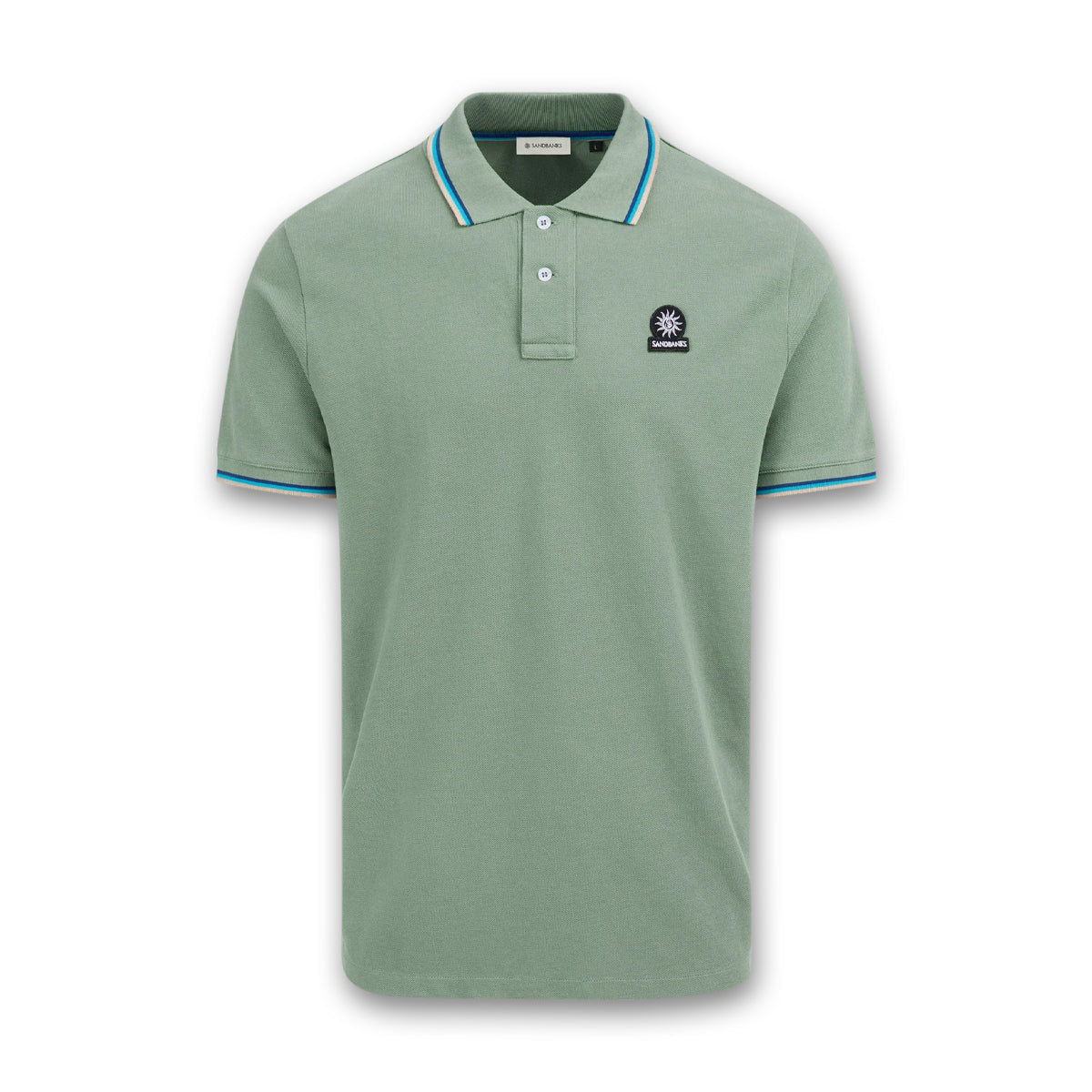 Sandbanks men's badge logo polo shirt in sage, made from 100% organic cotton. This classic fitting 2 button polo shirt features an embroidered badge logo on the chest, tri-colour tipped ribbed collar, cuff and back neck binding.
