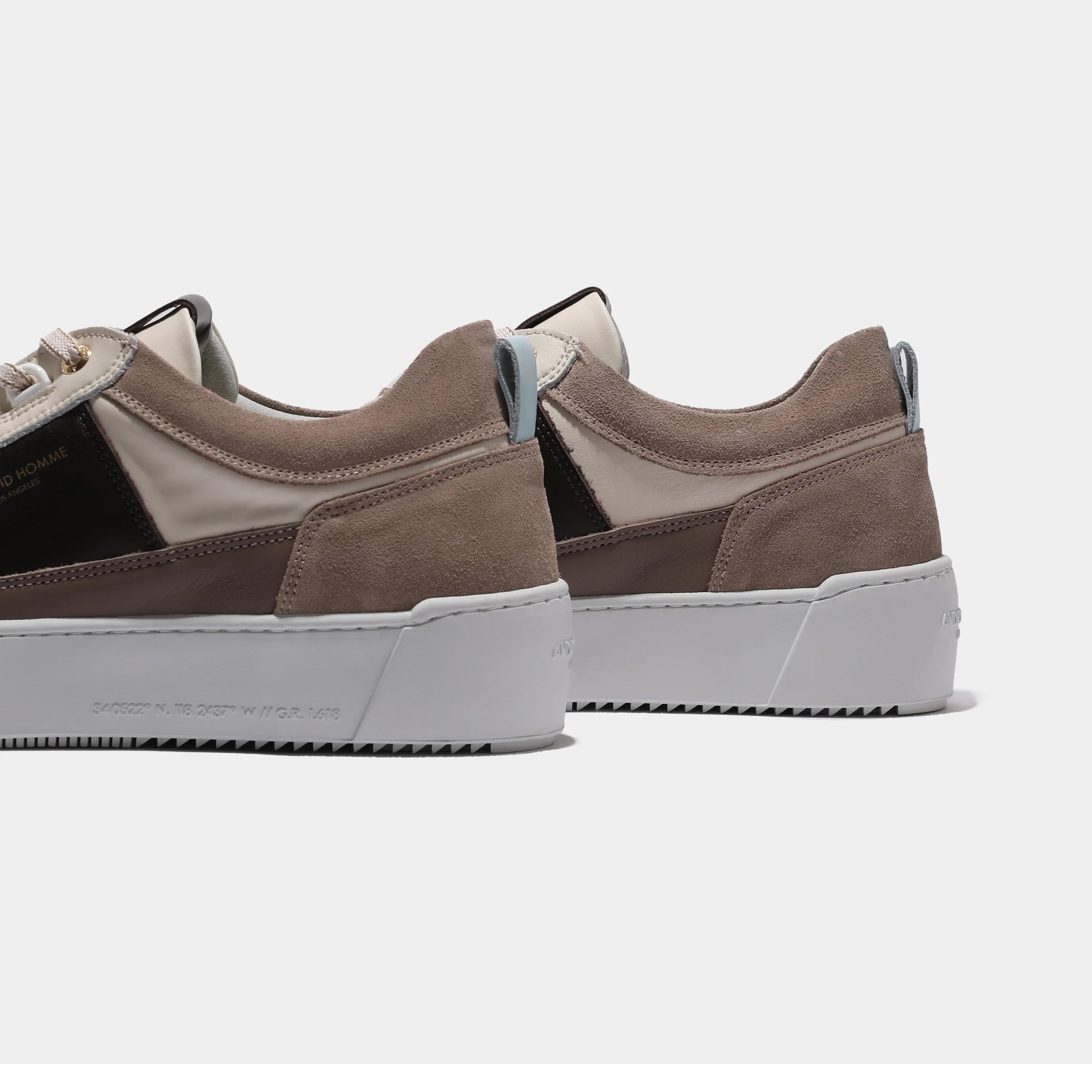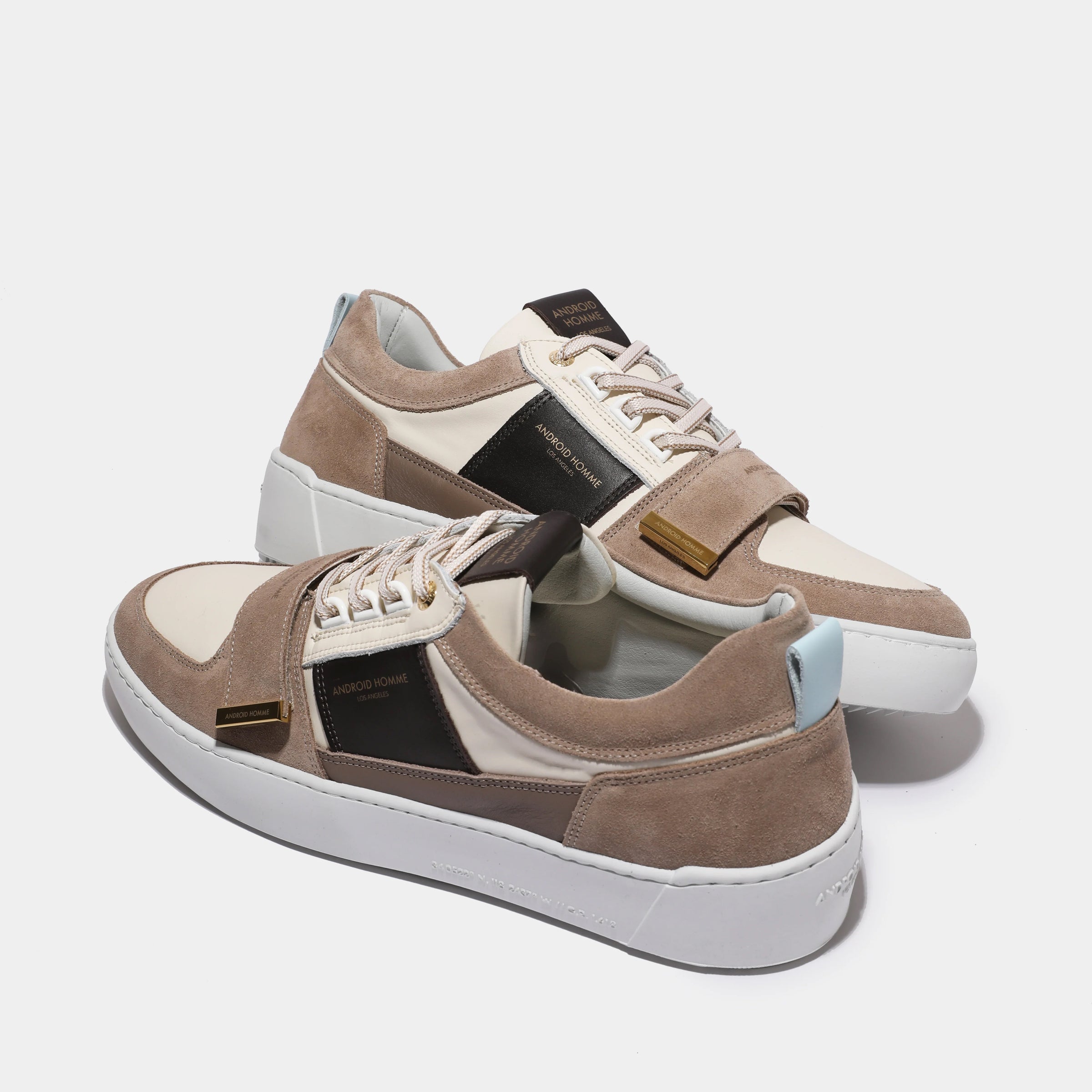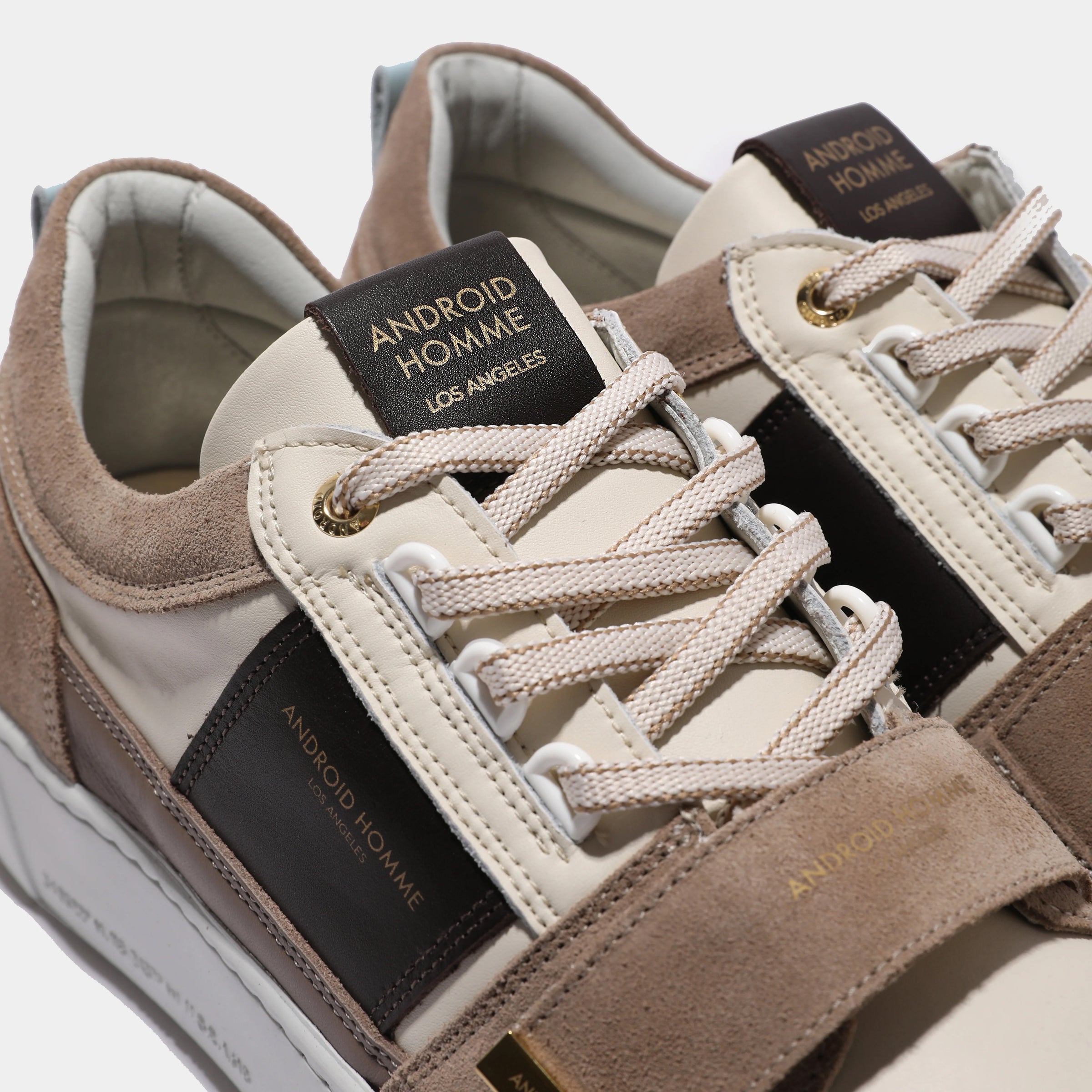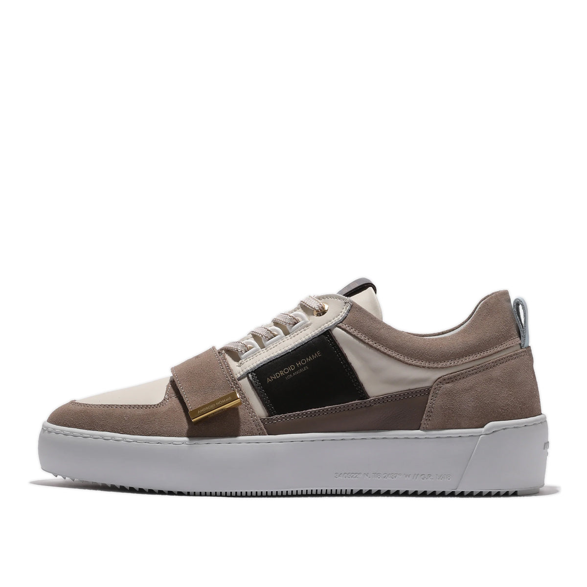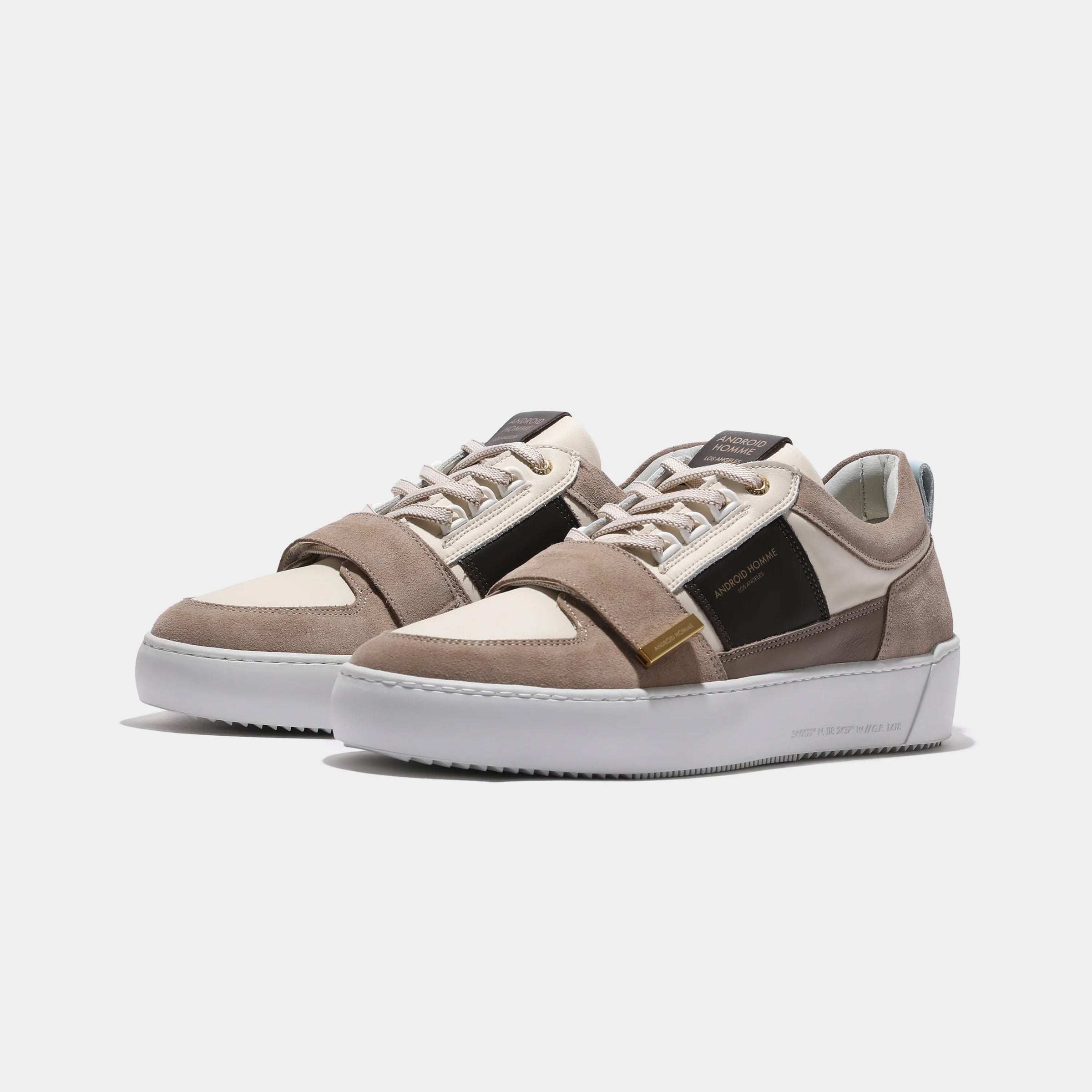 Crafted for those who demand a statement, the Point Dume Strap is a fusion of heritage design and modern edge. This bold silhouette is made from a dynamic mix of premium off white, taupe brown and white leathers and suedes, creating a sophisticated and multi-dimensional aesthetic. The standout feature is the Velcro vamp strap, elevated by a gold nickel logo tab—a detail that brings a new level of artistry to the design. A unique D-ring lace system offers a distinct and functional detail, while the exclusive customised rubber outsole with an embossed heel logo makes a subtle, yet powerful statement. It's a statement piece designed for those who move with intention.