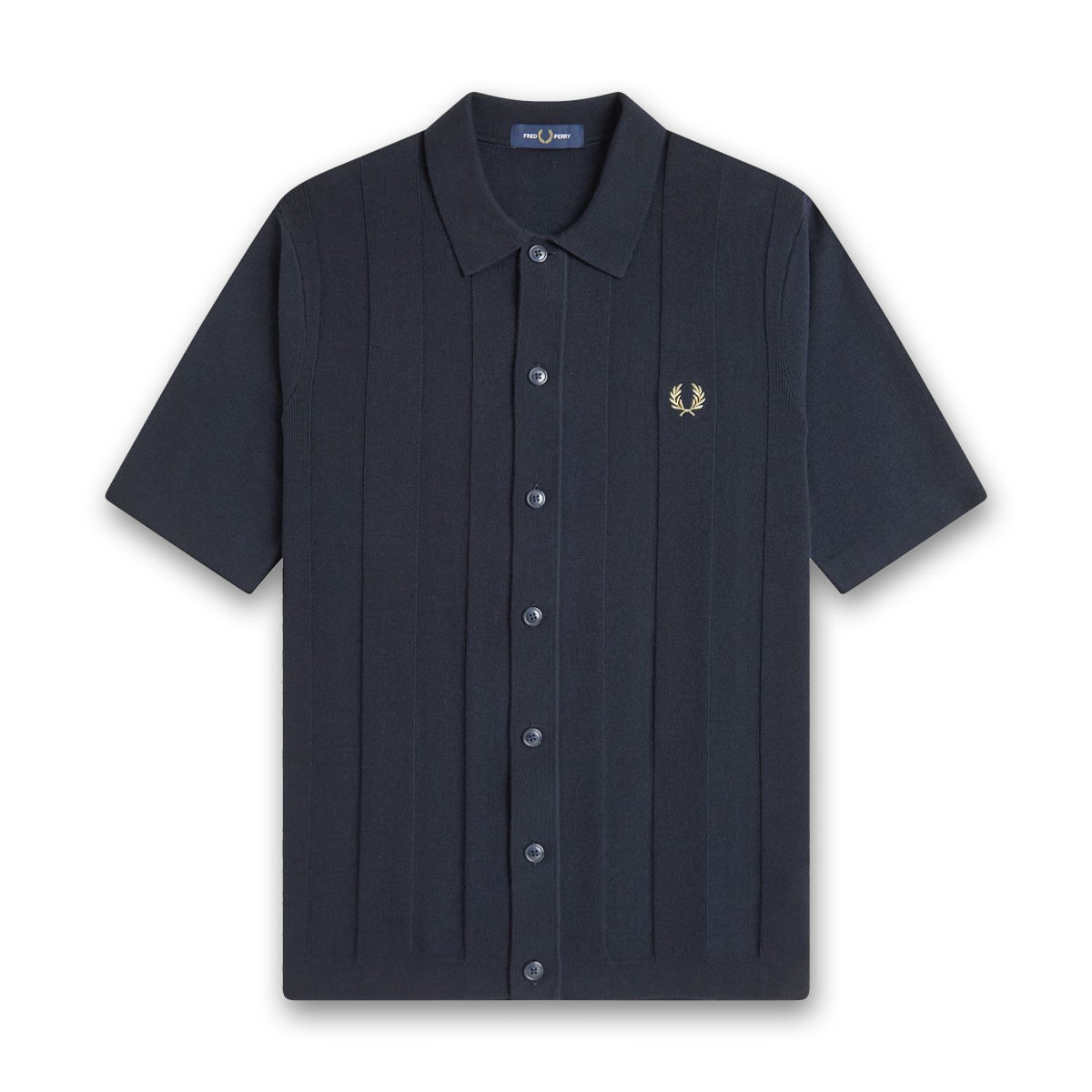 Short sleeved shirt is made in a combed cotton knit with alternating textures at its front to create a subtle stripe effect.