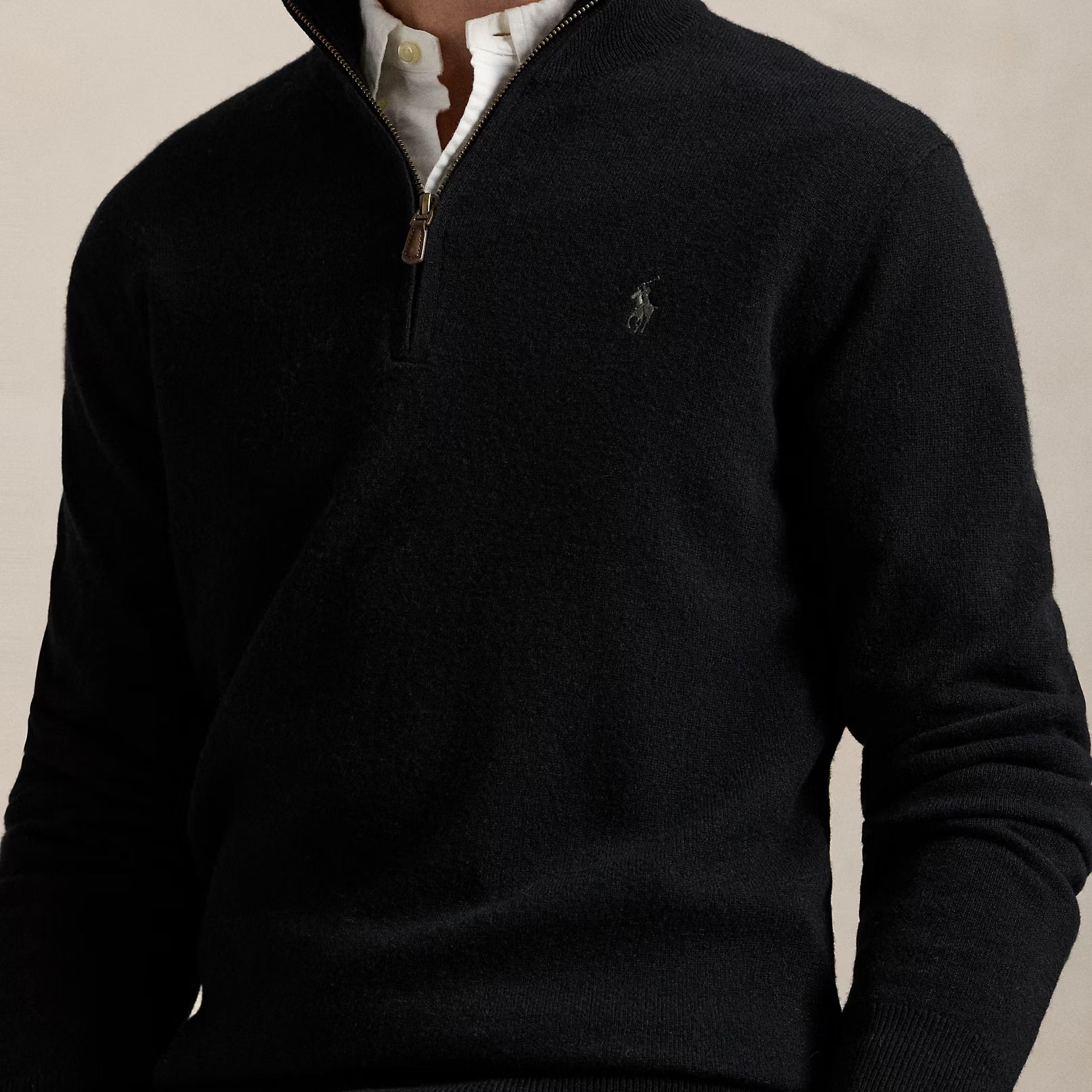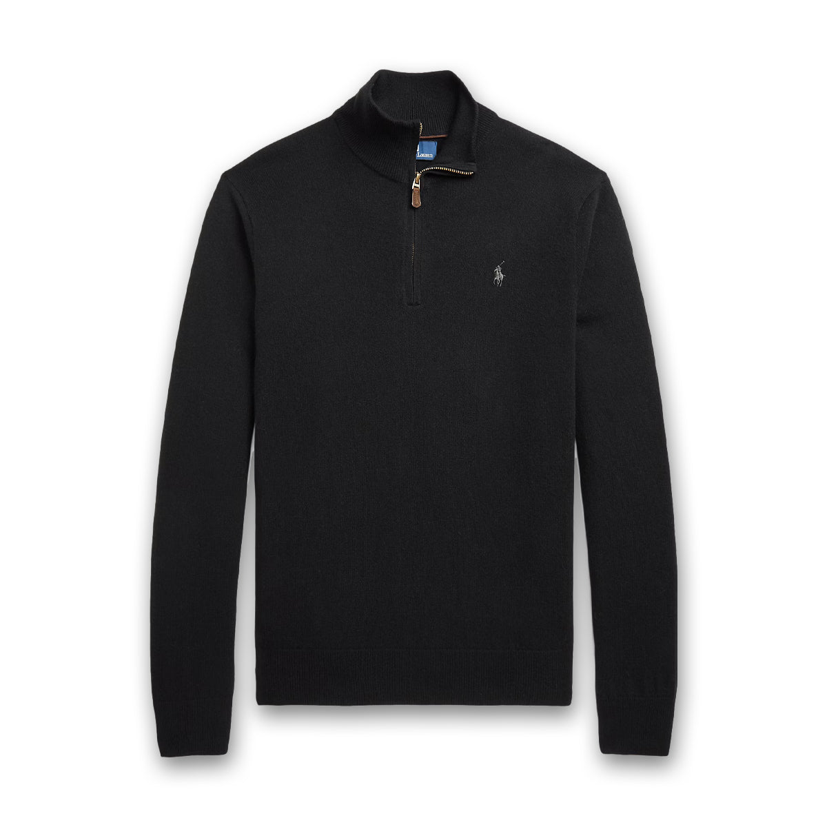 - Rib-knit mockneck. Quarter-zip front. Suede zipper pull custom-developed with a “Polo” logo. Faux-suede piping at the interior back of the neck.
