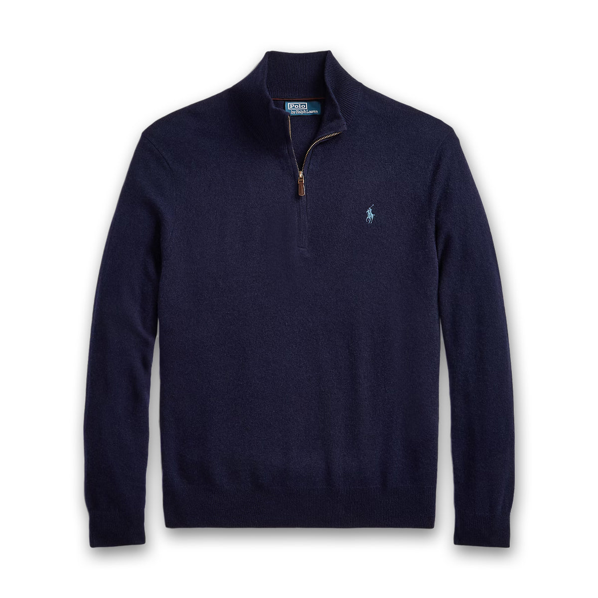 • Rib-knit mockneck. Quarter-zip front. Suede zipper pull custom-developed with a “Polo” logo. Faux-suede piping at the interior back of the neck.