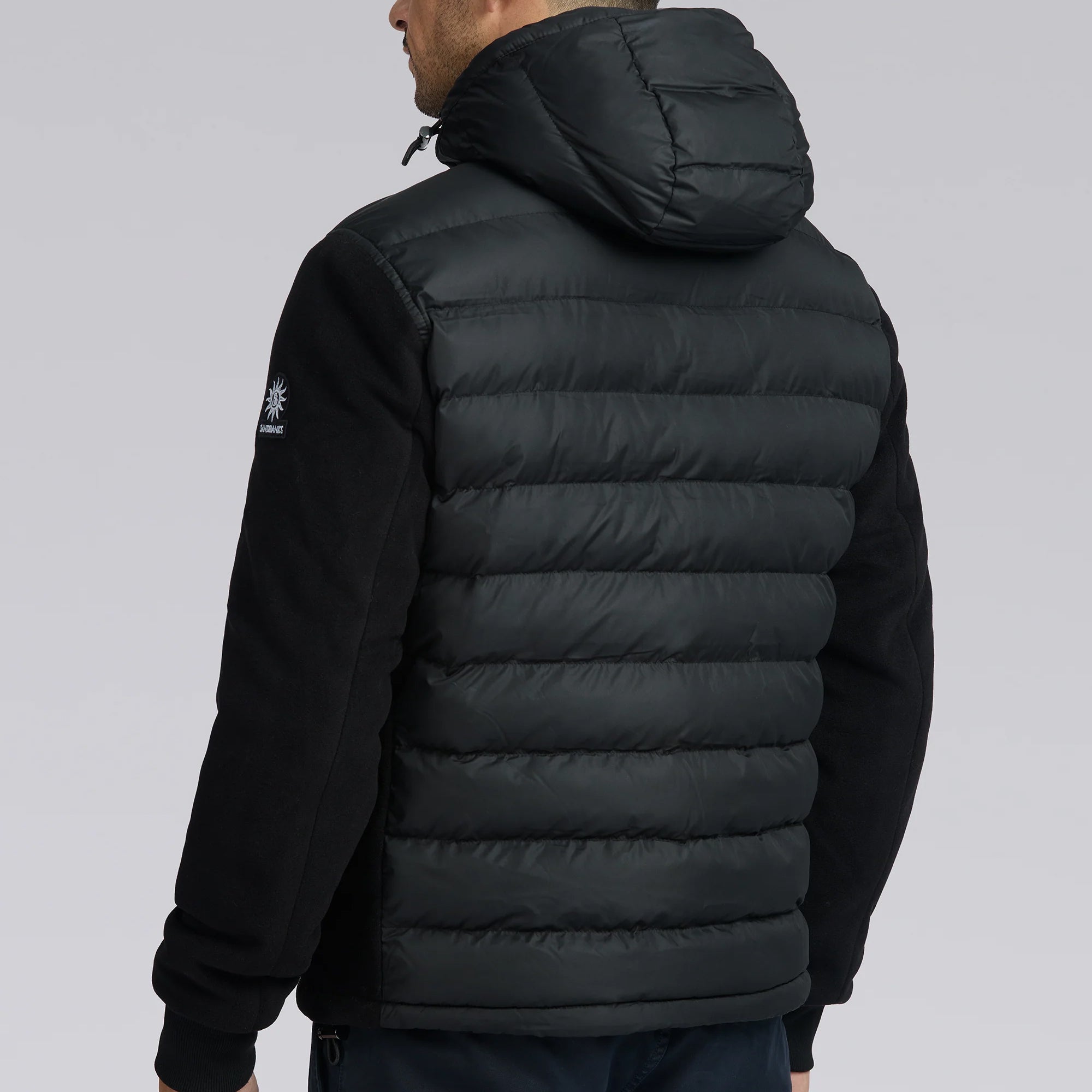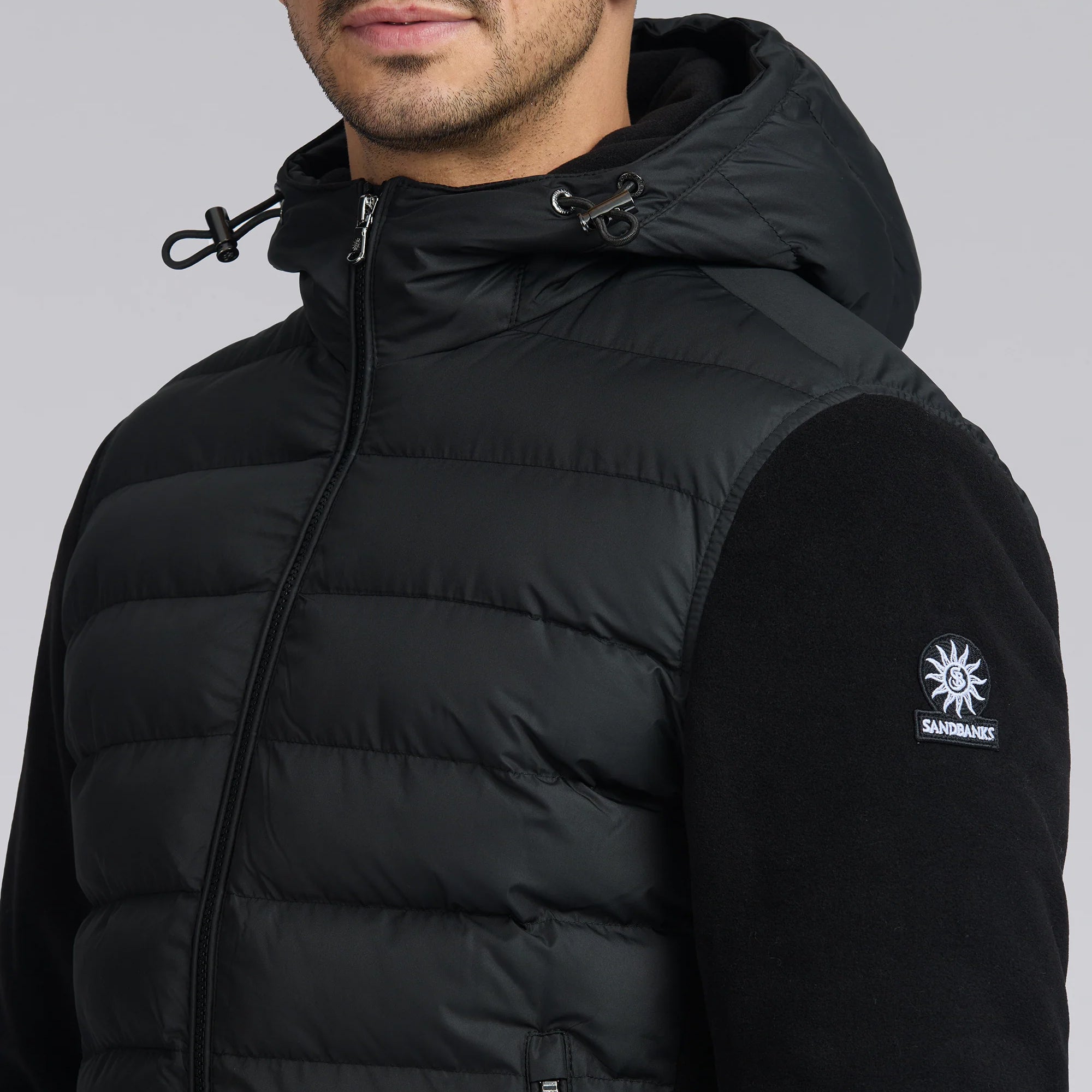 Sandbanks Outlander polar fleece hooded hybrid jacket in black, a warm and lightweight everyday casual jacket. This style features a warm eco-down puffer filled front and rear, polar fleece sleeves, hood internal and pockets for comfort and warmth, YKK 2-Way Vislon front zip and side zip pockets, embroidered logo badge and finished with gun metal branded cord adjusters and eyelets.